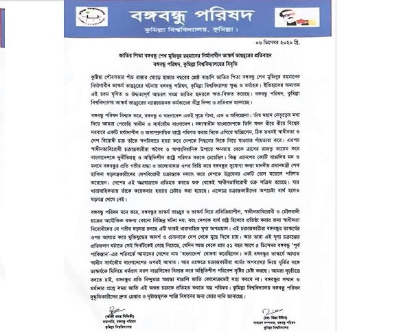 কুষ্টিয়ায় বঙ্গবন্ধু শেখ মুজিবুর রহমানের ভাস্কর্য ভাঙচুরের ঘটনায় তীব্র নিন্দা ও প্রতিবাদ জানিয়েছে কুমিল্লা বিশ্ববিদ্যালয়ের বঙ্গবন্ধু পরিষদ।