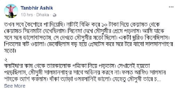 ‘‘১. তখন সবে কৈশোরে পা দিয়েছি। নাটাই বিক্রি করে ১০ টাকা দিয়ে ‘কেয়ামত থেকে কেয়ামত’ সিনেমাটা দেখেছিলাম। সিনেমা দেখে মৌসুমীর প্রেমে পড়লাম। আমি যাকে মনে মনে ভালোবাসতাম, সে দেখতে মৌসুমীর মতো ছিল। একটা ছুরিও কিনেছিলাম। পিতলের বাট ওয়ালা। ভেবেছিলাম বড় হয়ে প্রেমটেম করে মরে টরে যাব সালমানশাহ’র মত।