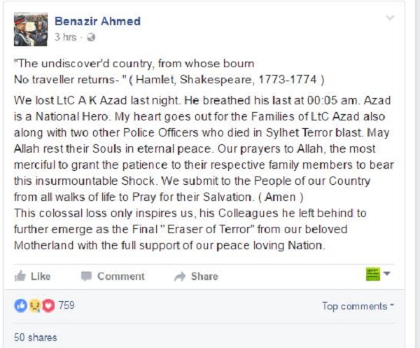 স্ট্যাটাসের শুরুতেই উইলিয়াম শেকসপিয়রের হেমলেট নাটকের বিখ্যাত উক্তি- ‘অদেখা দেশের ছোটো নদী থেকে কোনো পথিকই আর কখনো ফেরে না।’ দিয়ে শুরু করে বেনজির আহমেদ লেখেন, গতকাল রাতে আমরা লেফটেন্যান্ট কর্নেল মোহাম্মদ আবুল কালাম আজাদকে হারিয়েছি। রাত ১২টা ৫ মিনিটে তিনি শেষ নিঃশ্বাস ত্যাগ করেন। আজাদ আমাদের জাতীয় বীর। আজাদসহ সন্ত্রাসীদের বিস্ফোরণে নিহত অন্য দুই পুলিশ অফিসারের পরিবারের শোক আমাকেও স্পর্শ করেছে গভীরভাবে।