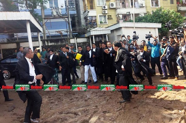 প্রত্যক্ষদর্শীরা বলেন, টিভি ক্যামরায় নিজের উপস্থিতি জানান দিতে অন্য সময়ের মতো ধাক্কাধাক্কি শুরু করেন আইনজীবীরা। এ পর্যায়ে ঢাকা বার কাউন্সিলের সভাপতি অ্যাডভোকেট খোরশেদ আলমের সঙ্গে সুপ্রিমকোর্টের জুনিয়র আইনজীবী মির্জা আল মাহমুদের কথা কাটাকাটি হয়। এসময় খোরশেদ আলমকে লাথি মারেন মির্জা আল মাহমুদ।