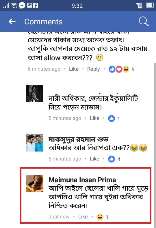 ঢাকা বিশ্ববিদ্যালয়ের সংগীত বিভাগের শিক্ষার্থী মাইমুনা ইনসান মন্তব্য করেন,“আপি (আপু) ছেলেরা খালি গায়ে ঘুরে আপনিও খালি গায়ে ঘুইরা অধিকার নিশ্চিত করেন।”