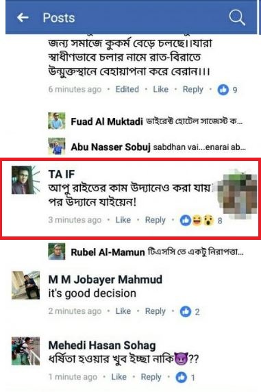 তবে “আপু রাইতের কাম উদ্যানেও করা যায়, ৮টার পর উদ্যানে যাইয়েন!” বিশ্ববিদ্যালয়ে নিজের বিভাগের তাঈফ নামের এক জুনিয়রের এই মন্তব্য তাকে হতবাক করেছে বলে জানান এই নারী শিক্ষার্থী।