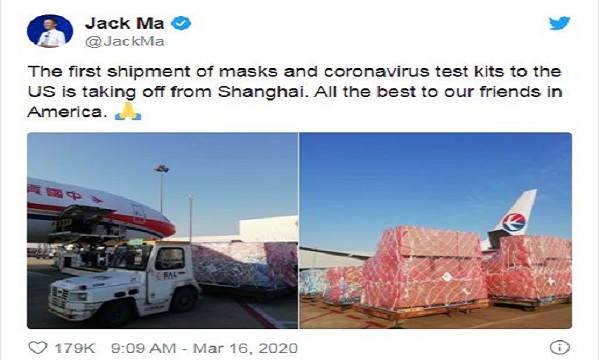 সোমবার চীনা এই বিলিয়নিয়ার তার নিজস্ব টুইট বার্তায় দুটি ছবি পোস্ট করে সেখানে লিখেছেন, করোনা চিহ্নিতকরণে সাংহাই থেকে বিমানে করে করোনা সংক্রান্ত মাস্ক ও কিট পাঠানো হচ্ছে বন্ধু রাষ্ট্র আমেরিকায়।