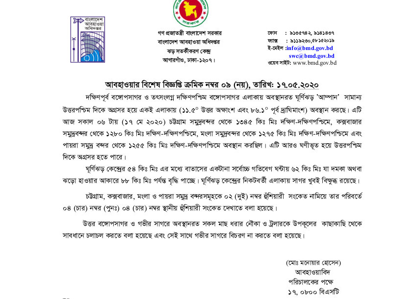 বঙ্গোপসাগরে অবস্থানরত ঘূর্ণিঝড় ‘আম্পান’ এর প্রভাবে সমুদ্র উত্তাল হয়ে উঠায় চট্টগ্রাম, মোংলা ও পায়রা সমুদ্রবন্দর এবং কক্সবাজার সৈকত এলাকাকে ৪ নম্বর স্থানীয় হুঁশিয়ারি সংকেত দেখিয়ে যেতে বলেছে আবহাওয়া অধিদপ্তর।