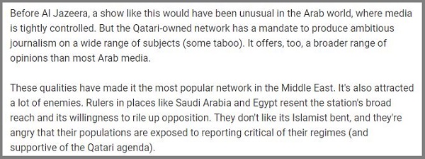 এনডিটিভি’তে প্রকাশিত এক বিশ্লেষণে বলা হয়েছে, রাজতন্ত্রের আরব বিশ্বে গণমাধ্যম কঠোরভাবে নিয়ন্ত্রিত। এর মাঝেও কাতারভিত্তিক নেটওয়ার্ক আল-জাজিরা সেই তুলনায় অনেক ভিন্নধর্মী সাংবাদিকতা করে এবং এমন অনেক বিষয়ও কাভার করে, যা অতি রক্ষণশীল আরব গণমাধ্যমগুলোতে নিষিদ্ধ। এছাড়া অন্যান্য আরব মিডিয়ার তুলনায় আল-জাজিরায় পাওয়া সংবাদ ও মতামতে জনমতের পরিসর অনেক বৈচিত্র্যময়।