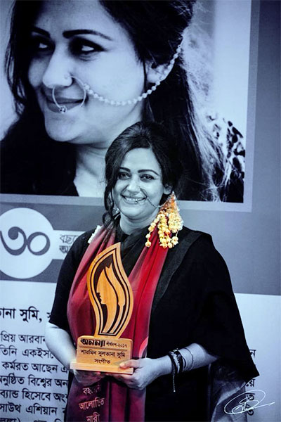 প্রতিবছরের মতো এবারও অনন্যা বর্ষব্যাপী আলোচিত-আলোকিত দশ কৃতি নারীকে সম্মাননা প্রদান করা হয়েছে শনিবার। কৃতি দশ নারীর মধ্যে একজন ছিলেন দেশের অত্যন্ত জনপ্রিয় ব্যান্ড চিরকুটের ভোকাল শারমিন সুলতানা সুমি। সংগীতে বিশেষ অবদানের জন্য শনিবার বিকেলে বাংলা একাডেমির আবদুল করিম সাহিত্যবিশারদ মিলনায়তনে ‘অনন্যা শীর্ষদশ সম্মাননা ২০১৭’ অনুষ্ঠানে এই সম্মাননা জানানো হয় তাকে। আর এমন সম্মাননা পেয়ে যেনো উচ্ছ্বাস ঠিকরে পড়ছে এই শিল্পীর।