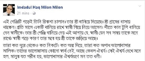 তিনি লিখেছেন: এই গেঞ্জিটি পড়েই তিনি রিকশা চালান। তার স্ত্রী বানিয়ে দিয়েছে। স্ত্রী বাড়িতে থাকেন। প্রতি মাসে একটি গেঞ্জি বানিয়ে রাখে, আর স্বামী গিয়ে সেটি নিয়ে আসেন। শীতে কান টুপি বানিয়ে দেন স্বামীকে। তার স্ত্রী গেঞ্জি বানিয়ে দেয় এই আশায় যে, স্বামী যেন সব সময় তাকে মনে রাখে। স্বামী পড়ে কারণ তার মনে হয় স্ত্রী তাকে জড়িয়ে আছে।
