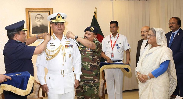 রোববার সকালে প্রধানমন্ত্রীর কার্যালয়ে প্রধানমন্ত্রী শেখ হাসিনার উপস্থিতিতে সেনাবাহিনী প্রধান জেনারেল আজিজ আহমেদ ও বিমান বাহিনী প্রধান এয়ার চীফ মার্শাল মাসিহুজ্জামান সেরনিয়াবাত নৌবাহিনী প্রধানকে এডমিরাল র্যাংক ব্যাজ পরিয়ে দেন।