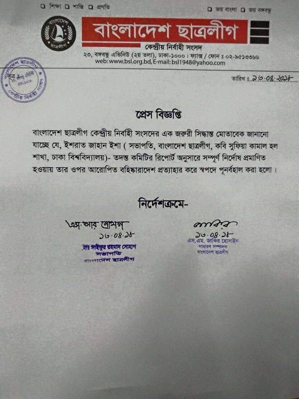 ছাত্রলীগ থেকে বহিষ্কৃত সুফিয়া কামাল হলের ছাত্রলীগ সভাপতি ইফফাত জাহান এশার বহিষ্কারাদেশ প্রত্যাহার করে নিয়েছে বাংলাদেশ ছাত্রলীগ।