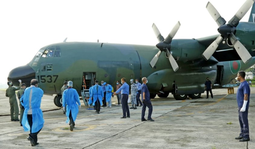 করোনাভাইরাস এর কারণে উদ্ভুত পরিস্থিতিতে শুভেচ্ছা সামগ্রী হিসেবে নিত্য প্রয়োজনীয় দ্রব্যাদি ও মালদ্বীপে কর্মরত ১১ জন বাংলাদেশি ডাক্তারদের জরুরি ভিত্তিতে কর্মস্থলে পাঠানোর জন্য আজ মালদ্বীপের উদ্দেশে বাংলাদেশ বিমান বাহিনীর একটি সি-১৩০বি পরিবহন বিমান ঢাকা ছেড়েছে।