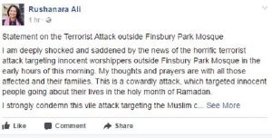 যুক্তরাজ্যের উত্তর লন্ডনে ফিন্সবারি পার্ক মসজিদের কাছে গাড়ি দিয়ে হামলার ঘটনায় ‘গভীরভাবে মর্মাহত’ বাংলাদেশি বংশোদ্ভূত ব্রিটিশ এমপি রুশনারা আলী শোক জানিয়েছেন। এই ‘ভয়াবহ আক্রমণের’ বিরুদ্ধে অবিলম্বে ব্যবস্থা গ্রহণের জন্য সরকারের প্রতি আহ্বান জানান তিনি।