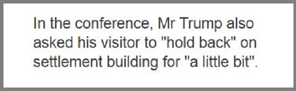 অথচ ডোনাল্ড ট্রাম্প সরকার গঠনের পর খুব অল্প সময়ের মধ্যেই পশ্চিম তীরে ফিলিস্তিনিদের ব্যক্তি মালিকানাধীন জমিতে ৪ হাজার ইহুদি বসতি স্থাপনকারীর বাড়িঘর তৈরিকে বৈধতা দেয়া একটি বিতর্কিত আইন পাশ করে ইসরাইলের পার্লামেন্ট। এ সিদ্ধান্তের বিরুদ্ধে না গিয়ে গত সংবাদ সম্মেলনে সংবাদ সম্মেলনে তিনি ফিলিস্তিন ভূখণ্ডে নতুন ইহুদি বসতি স্থাপন কার্যক্রম থেকে কিছুটা ক্ষান্ত হতে নেতানিয়াহুকে অনুরোধ জানান।