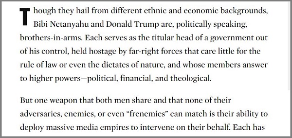 কিন্তু শুধু দুর্বলতা নয়, একটি যোগ্যতার দিক থেকে মিলও আছে ট্রাম্প-নেতানিয়াহুর মধ্যে, যার ধারে-কাছেও নেই তাদের অন্যান্য শত্রু-মিত্র বা বন্ধুর নামে শত্রুরা। সেটি হলো গণমাধ্যমকে নিজের