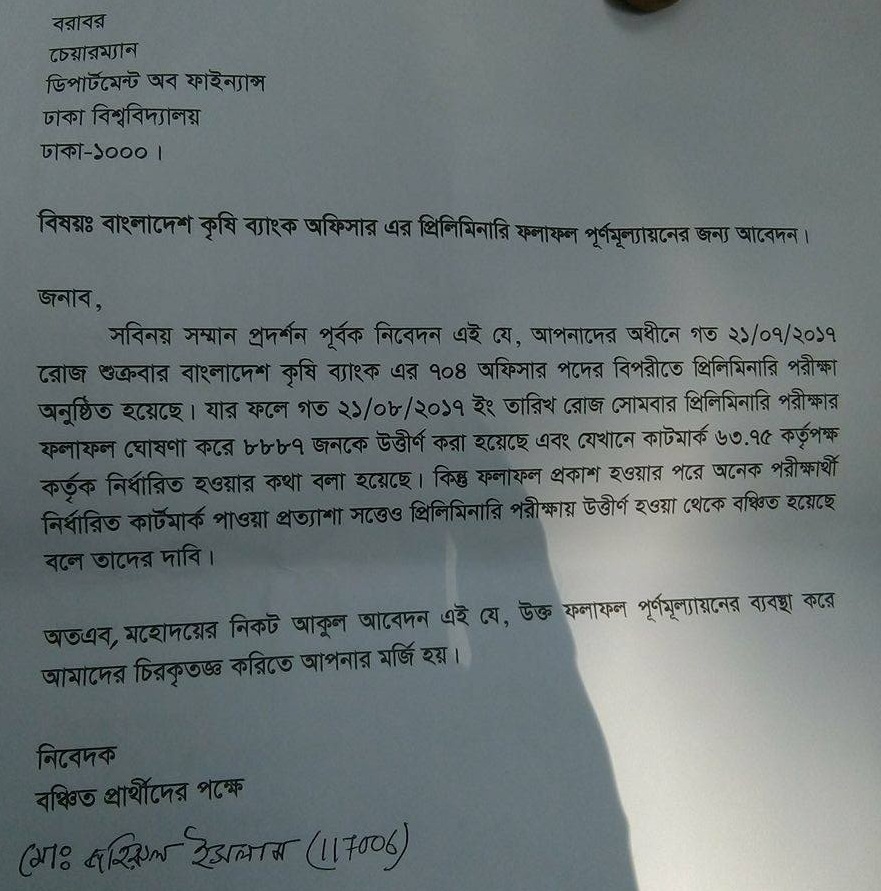 বুধবার বিকেলে ফল পুনর্মূল্যায়নের দাবি নিয়ে কয়েকজন পরীক্ষার্থী ব্যাংকার্স সিলেকশন কমিটির সদস্য-সচিব (মহাব্যবস্থাপক) মোঃ মোশারফ হোসেন খানের সঙ্গে তার কার্যালয়ে গিয়ে দেখা করে দুই শতাধিক পরীক্ষার্থীর স্বাক্ষরসহ আবেদনপত্র দিতে গেলে তিনি তা গ্রহণ করেননি বলে জানিয়েছেন তিতুমীর কলেজ থেকে পাশ করা জহিরুল ইসলাম।