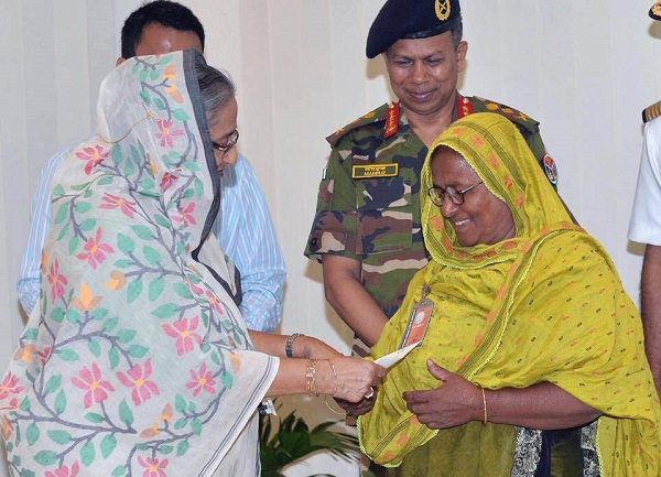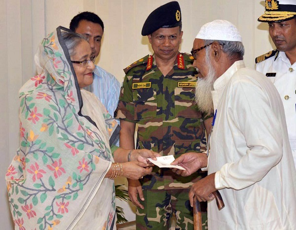 খেতাবপ্রাপ্ত মুক্তিযোদ্ধাদের উত্তরাধীকারদের মধ্যে আর্থিক অনুদানের চেক প্রদান করেন প্রধানমন্ত্রী শেখ হাসিনা।