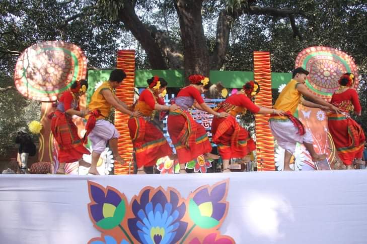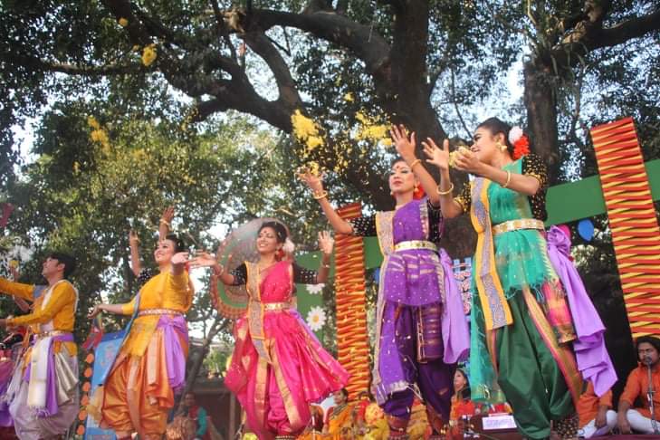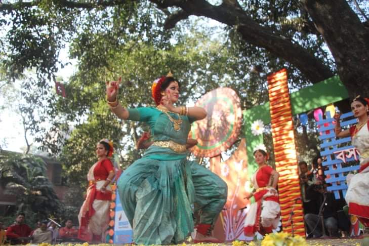 সুরের মূর্ছনার আবেশ ছড়িয়ে পড়ে পুরো বকুলতলায়। একে একে পরিবেশন করা হয় গান, আবৃত্তি এবং নৃত্য। নানা বয়সী মানুষের পদচারণায় মুখর হয়ে উঠে চারুকলা প্রাঙ্গণ। চারুকলা জুড়েই যেন লেগেছে হলুদ রঙয়ের ছোঁয়া। নারীরা নিজেদের বসন্তের সাজে সাজাতে খোপায়-গলায়-মাথায় পরেছে গাঁদা ফুলের মালা। হাতে রেশমি চুড়ি আর পরনে বাসন্তী রঙ্গের শাড়ি।