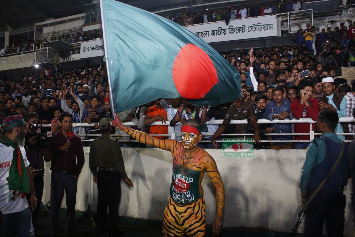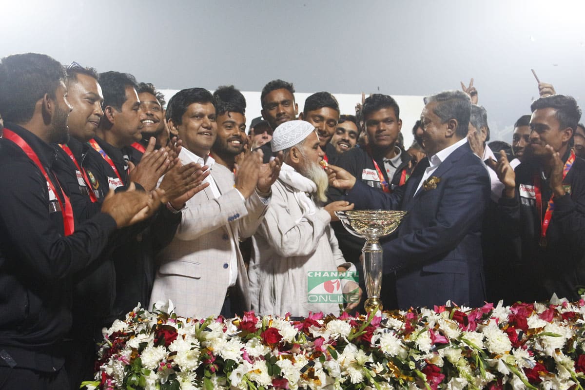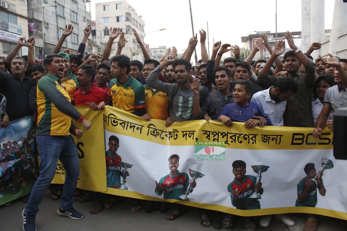 প্রধান ফটকের সামনে ঝুলছে বিশাল আকৃতির ব্যানার। শরিফুল-সাকিবদের ছবির মাঝে বড় অক্ষরে লেখা- ওয়ার্ল্ড চ্যাম্পিয়ন।