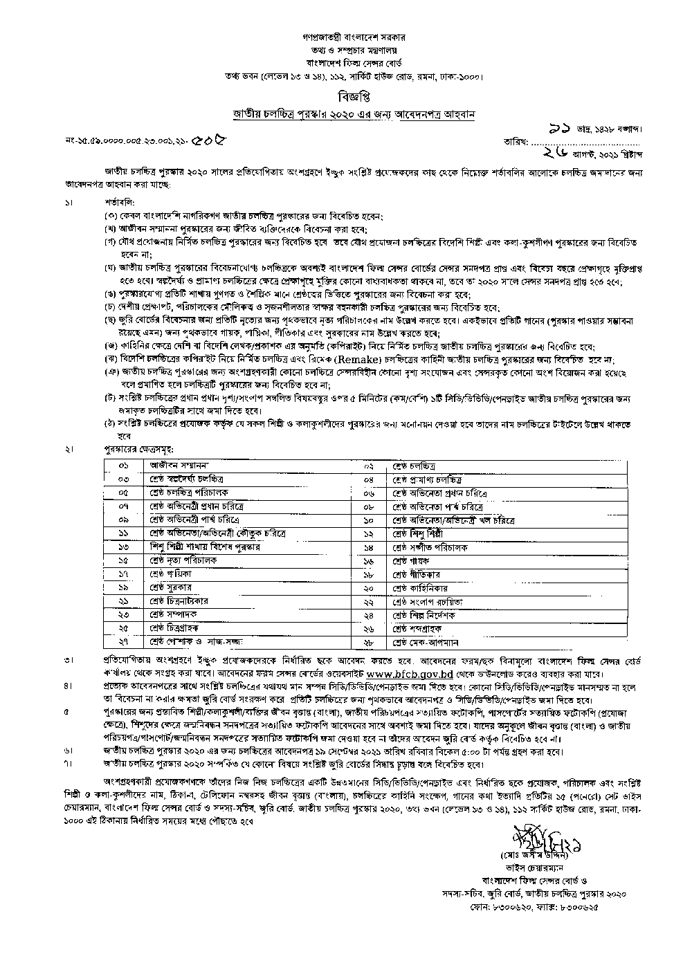 ২০২০ সালে মুক্তিপ্রাপ্ত বাংলা চলচ্চিত্র আগামি ১৯ সেপ্টেম্বর বিকেল ৫টার মধ্যে জমা দেয়ার আহ্বান জানিয়ে বলা হয়েছে, আগ্রহীদের উন্নতমানের সিডি/ ডিভিডি/পেনড্রাইভে জমা দিতে হবে এবং চলচ্চিত্র সেন্সর বোর্ড অফিস ও ওয়েবসাইট থেকে এর জন্য আবেদনপত্র সংগ্রহ করতে বলা হয়েছে।