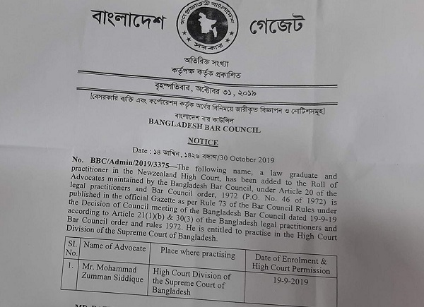ল’ গ্র্যাজুয়েট ও নিউজিল্যান্ড হাইকোর্টের প্র্যাকটিশনার জুম্মান সিদ্দিকীকে আইনজীবী তালিকাভুক্তির পরীক্ষা ছাড়াই সরাসরি হাইকোর্টের আইনজীবী হিসেবে অন্তর্ভুক্তির গেজেটের কার্যক্রম স্থগিত করেছেন হাইকোর্ট।