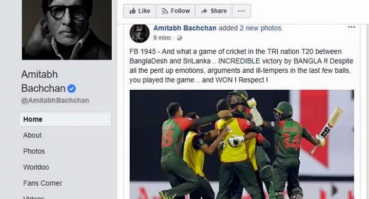 সেখানে বলিউডের এই জীবন্ত কিংবদন্তি উচ্ছ্বাস প্রকাশ করে লিখেছেন, দারুণ একটা খেলা ক্রিকেটের ট্রাইনেশন সিরিজের বাংলাদেশ-শ্রীলঙ্কার ম্যাচ। বাংলার অবিশ্বাস্য জয়!