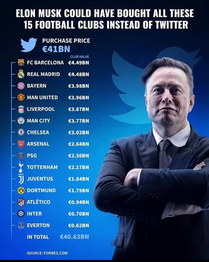 ৪১ বিলিয়ন ইউরোতে সামাজিক যোগাযোগমাধ্যম টুইটার কিনে সাড়া ফেলে দিয়েছেন টেসলার কর্ণধার ইলন মাস্ক। যে পরিমাণ অর্থ দিয়ে তিনি টুইটার কিনেছেন, তার পরিবর্তে অনায়াসে হতে পারতেন ১৫টি ইউরোপিয়ান ফুটবল ক্লাবের মালিক।