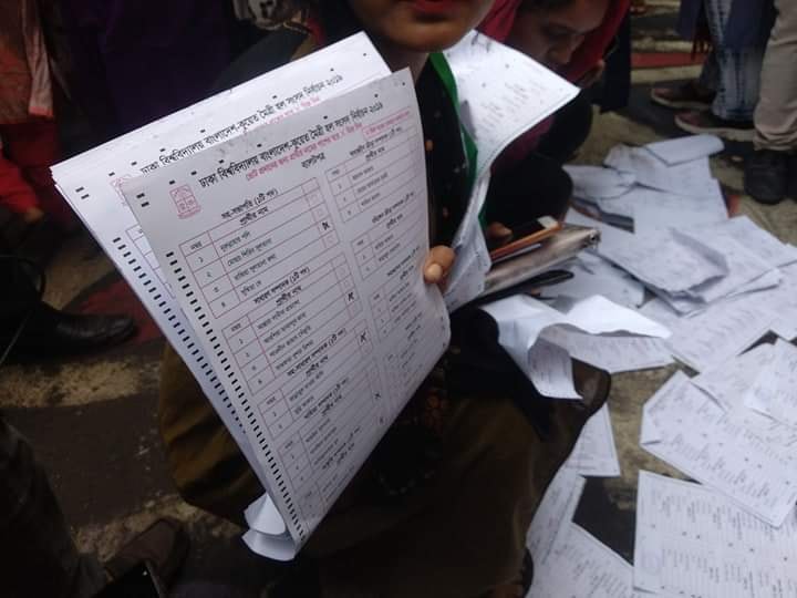 কিন্তু সোমবার সকালে ভোটকেন্দ্রের পাশে আমাদের রিডিং রুম থেকে প্রভোস্ট ম্যাম বস্তা ভর্তি সিল মারা ব্যালট পেপার সরাচ্ছেন। সেখান থেকে এক বস্তা ব্যালট পেপার আমরা ছিনিয়ে আনি ও ভোট বর্জন করি’।