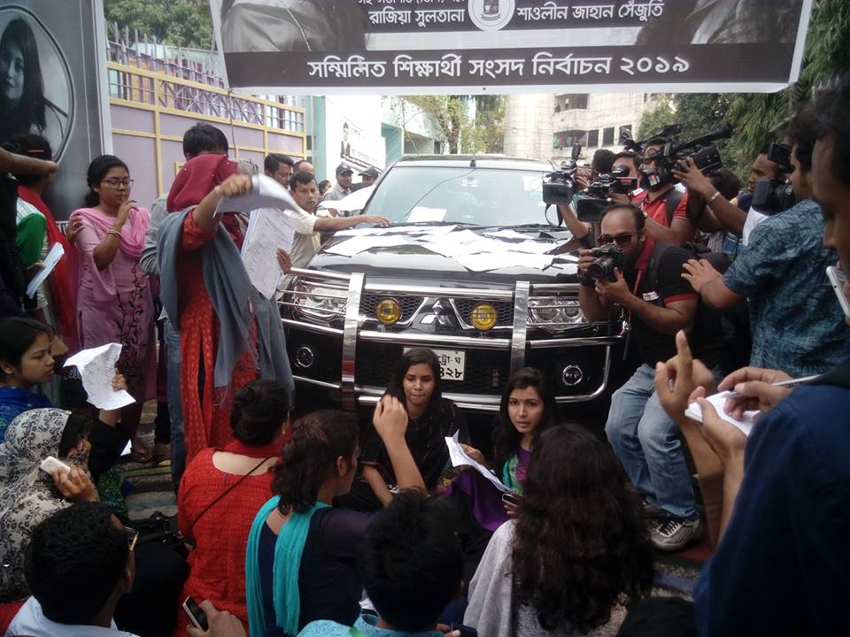সকাল ৮টায় হলের মেয়েরা লাইনে দাঁড়ায়। এ সময় প্রক্টর গিয়ে সেখানে কথা বলে সময় কাটানোর চেষ্টা করেন। পরে শিক্ষার্থীরা জোর করে ঢুকলে সিল মারা ব্যালট উদ্ধার করা হয়।