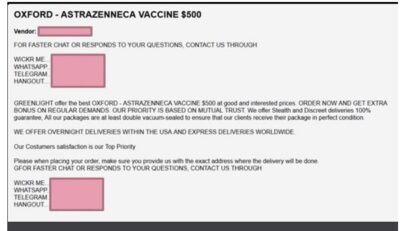 সাইবার সিকিউরিটি কোম্পানি চেক পয়েন্টের গবেষকরা গত জানুয়ারি থেকে হ্যাকিং ফোরাম ও অন্যান্য মার্কেটেপ্লেস পর্যবেক্ষণ করছে। সেসময়ে ভ্যাকসিন নিয়ে এসব বিজ্ঞাপন প্রথম চোখে পড়ে। তারা বলছেন, সেসময় যেটা ১২০০ ছিলো বর্তমানে সেই বিজ্ঞাপনের পরিমাণ ৩ গুণ বেড়েছে।