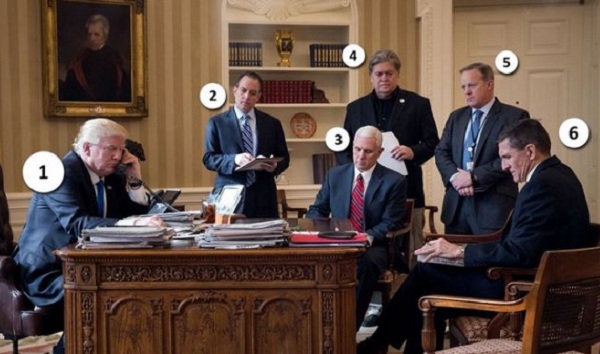 ছবিটি গত ২৮ জানুয়ারির। যুক্তরাষ্ট্রের নতুন প্রেসিডেন্ট ডোনাল্ড ট্রাম্পকে তখন ফোনে অভিনন্দন জানাচ্ছিলেন রাশিয়ার প্রেসিডেন্ট ভ্লাদিমির পুতিন, আর ট্রাম্পের সঙ্গে তার ঘনিষ্ঠরা। সাত মাস পর সেই ছবিটি দিয়েই ট্রাম্প প্রশাসনের টালমাটাল অবস্থা তুলে ধরেছে বিবিসি। ট্রাম্প কীভাবে ঘনিষ্ঠ মহলশূন্য হয়ে পড়ছেন, তারই এক উপস্থাপন রয়েছে তাতে।