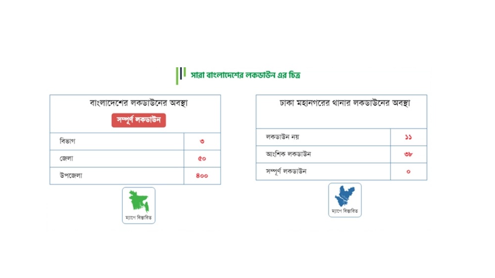 স্বাস্থ্য মন্ত্রণালয়ের ওয়েবসাইটে দেশের তিনটি বিভাগ, ৫০টি জেলা ও ৪০০টি উপজেলাকে পুরোপুরি লকডাউন (রেড জোন বিবেচিত) দেখানো হচ্ছে। আংশিক লকডাউন (ইয়েলো জোন বিবেচিত) দেখানো হচ্ছে পাঁচটি বিভাগ, ১৩টি জেলা ও ১৯টি উপজেলাকে। আর লকডাউন নয় (গ্রিন জোন বিবেচিত) এমন জেলা দেখানো হচ্ছে একটি এবং উপজেলা দেখানো হচ্ছে ৭৫টি।