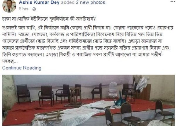 এ সংক্রান্ত অভিযোগের পরিপ্রেক্ষিতে ফেসবুকে স্ট্যাটাস দিয়েছেন পিটিবিনিউজ ডটকমের প্রধান সম্পাদক আশীষ কুমার দে। পুনরায় ভোট গ্রহণের পক্ষে মত দিয়ে নিজের দেওয়া স্ট্যাটাসে তিনি বলেন: “শুরুতেই বলে রাখি, এই নির্বাচনে আমি কোনো প্রার্থী ছিলাম না। কোনো প্যানেলের পক্ষেও প্রচারণায় নামিনি। দক্ষতা, যোগ্যতা, কর্মকাণ্ড ও পারিপার্শ্বিকতা বিবেচনায় নিয়ে বিভিন্ন পদে ভিন্ন ভিন্ন প্যানেলের প্রার্থীদের ভোট দিয়েছি এবং ঘনিষ্ঠজনদের ভোট দিতে বলেছি। এছাড়া আমাদের বা আমার রাজনৈতিক মতাদর্শগত একজন সদস্য প্রার্থীর পক্ষে সরাসরি সক্রিয় প্রচারণায় ছিলাম এবং তিনি জয়লাভ করেছেন। এছাড়া বিজয়ী ও পরাজিত সকল প্রার্থীই আমাদের বা আমার সতীর্থ-সহকর্মী। সবার জন্যই আমার শুভ কামনা। তবুও সাংবাদিক সমাজের মর্যাদার কথা বিবেচনায় কিছু না লিখে পারছি না।