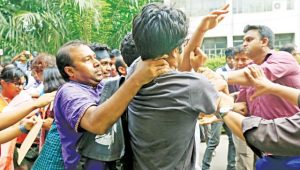 ‘কিন্তু তারা কোনভাবেই আমাদের কথায় কর্ণপাত না করায় আমরা গেটের তালা ভেঙ্গে ভেতরে প্রবেশ করি। তখন সহকারী প্রক্টর রবিউল ইসলামের নেতৃত্বে, মাহমুদুর রহমান বাহলুল, মিনা মাহবুব, এমআইএস বিভাগের প্রভাষক রাকিবুল হাসানসহ উপস্থিত অন্য শিক্ষকরা আমাদের ওপর হামলা করেন।’