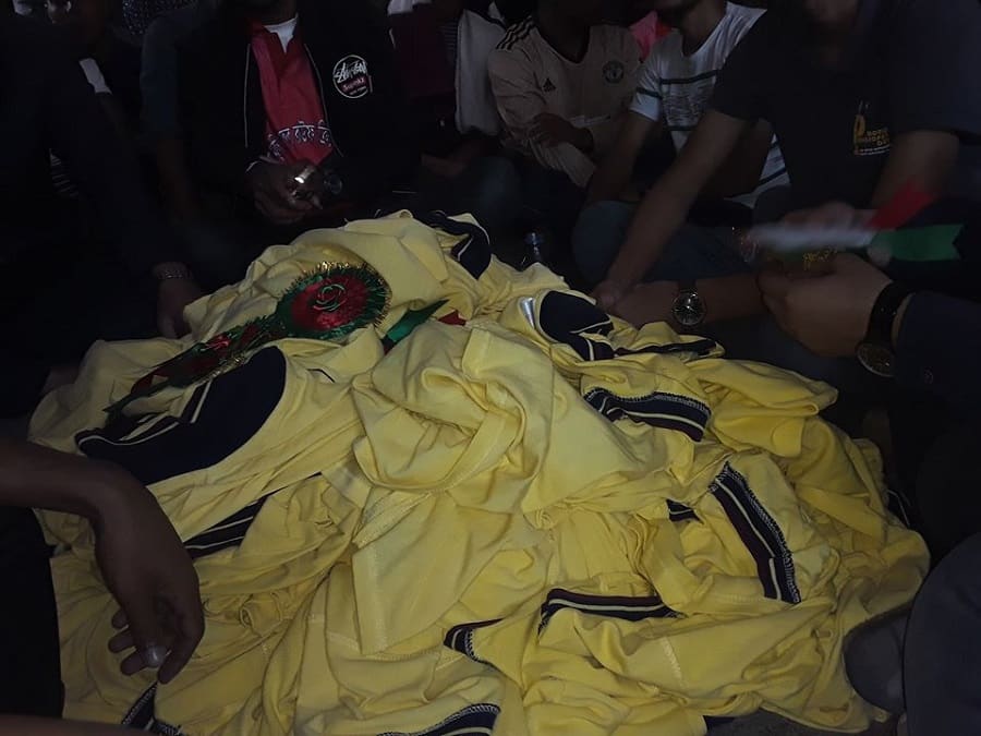 এসময় হল অফিসের সামনে টি-শার্ট ফেলে রেখে বিভিন্ন স্লোগান দিতে থাকেন আন্দোলনরত শিক্ষার্থীরা।