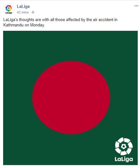 মঙ্গলবার বাংলাদেশের একটি পতাকা পোস্ট করে শোকবার্তা জানিয়েছে লা লিগা। অফিসিয়াল ফেসবুক পাতায় পোস্ট করা পতাকার সঙ্গে লেখা হয়েছে, ‘সোমবার কাঠমান্ডুতে বিমান দুর্ঘটনায় ক্ষতিগ্রস্তদের পাশে থাকবে লা লিগা।’