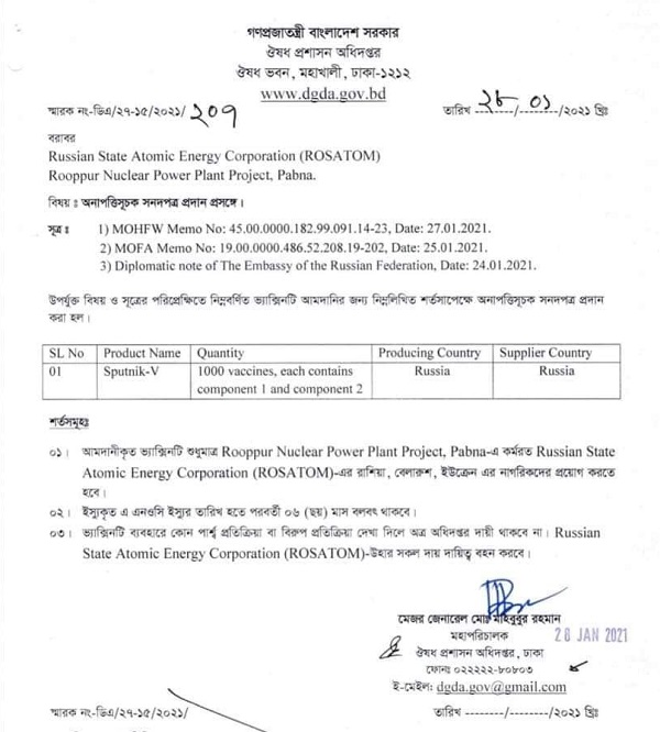 বৃহস্পতিবার ঔষধ প্রশাসন অধিদপ্তর স্পুটনিক ভ্যাকসিনের অনুমোদন দেয়।