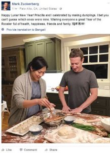 নতুন চান্দ্রবর্ষের শুভেচ্ছা। প্রিসিলা এবং আমি ডাম্পলিং (পুডিংবিশেষ) বানিয়ে এর উদযাপন করছি। আমি বাজি ধরে বলতে পারি, তোমরা অনুমান করতে পারবে না কোনগুলো আমার। সকলের জন্য একটি অসাধারণ বছরের প্রত্যাশা করেন তিনি, চীনা ভাষাতেও (মান্দারিন) নতুন বর্ষের শুভকামনা জানান জাকারবার্গ।