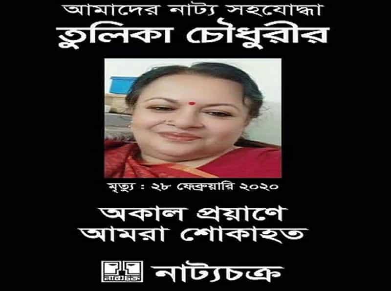 নাট্যচক্রের সক্রিয় সদস্য মঞ্চকর্মী ও অভিনেত্রী তুলিকা চৌধুরীর মৃত্যুতে গভীর শোক প্রকাশ করেছে কানাডার মুক্তবিহঙ্গ নাট্য সংগঠন।