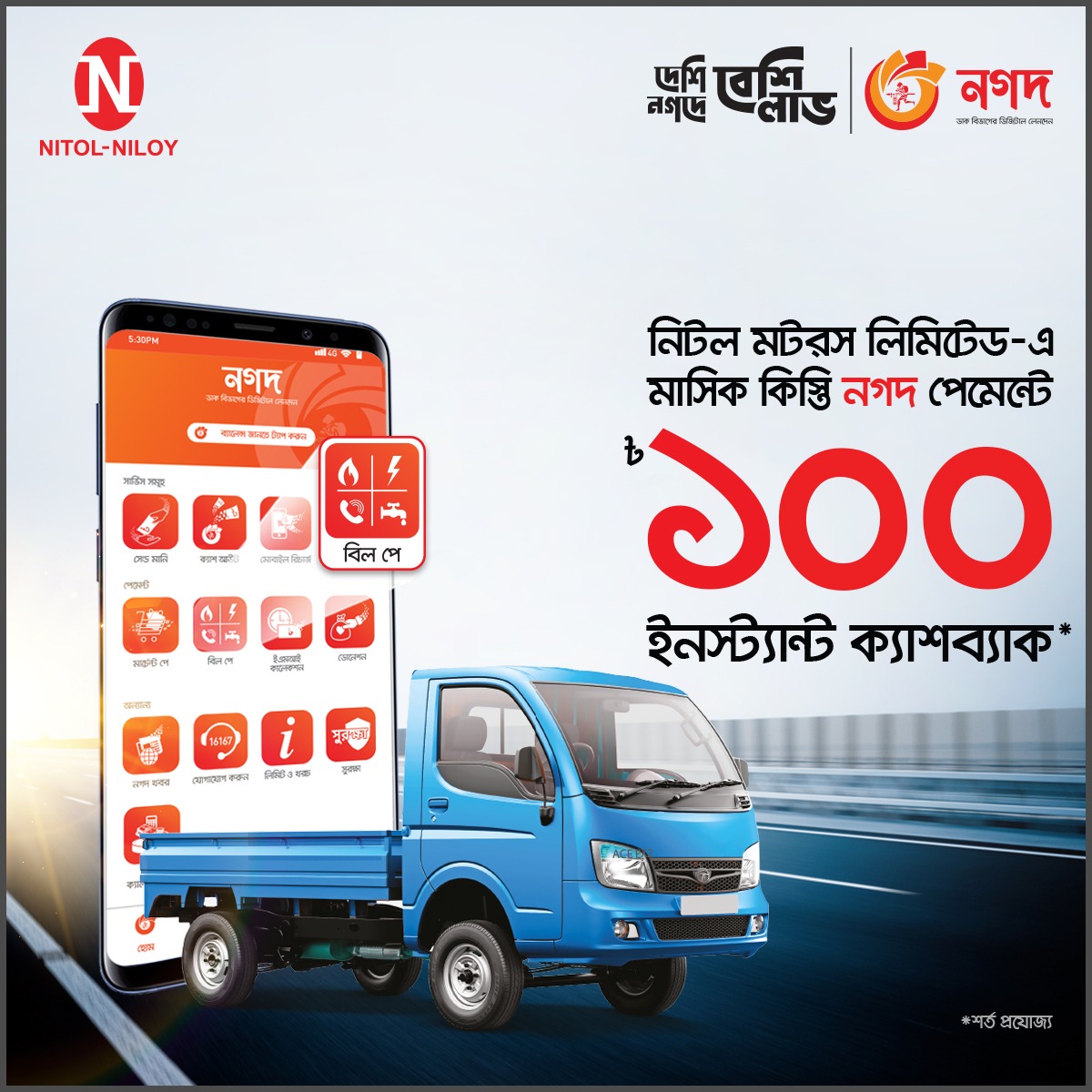 নিটল মটরস লিমিটেড থেকে ট্রাক, পিকআপসহ অন্যান্য গাড়ির মাসিক কিস্তি ‘নগদ’-এর মাধ্যমে পেমেন্ট করলে সর্বোচ্চ ১০০ টাকা পর্যন্ত ইনস্ট্যান্ট ক্যাশব্যাক পাওয়া যাবে।