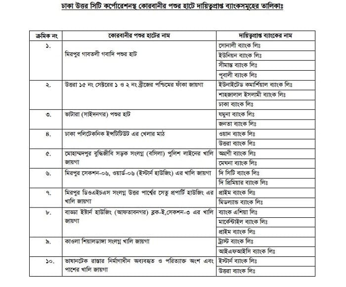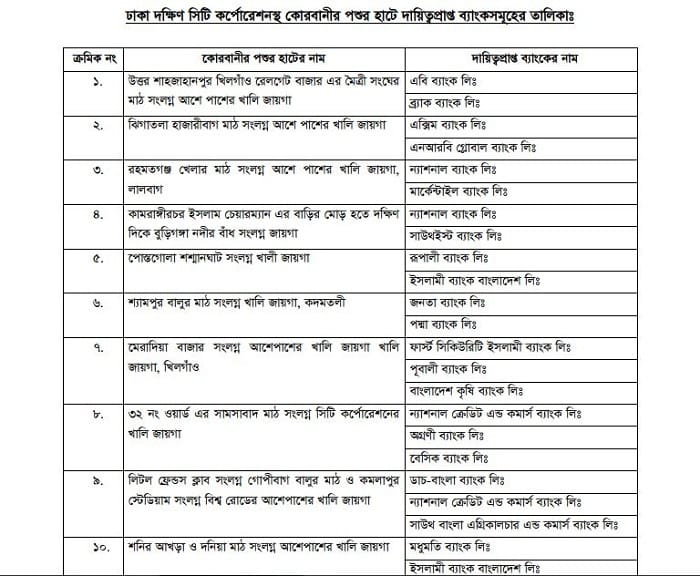 ঢাকার বাইরে যেসব জেলায় বাংলাদেশ ব্যাংকের অফিস রয়েছে, সেখানে সংশ্লিষ্ট সিটি করপোরেশন বা পৌরসভার অনুমোদিত পশুর হাটগুলোতে বাংলাদেশ ব্যাংকে স্থানীয় অফিসের নেতৃত্বে গৃহীত অনুরূপ ব্যবস্থায় প্রয়োজনীয় সহায়তা দেওয়ার জন্যও কর্তৃপক্ষের নির্দেশনা রয়েছে।