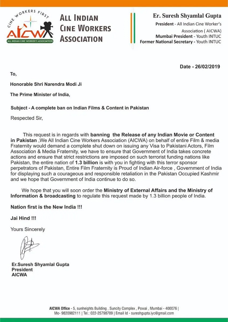 ‘অল ইন্ডিয়ান সিনে ওয়ার্কার্স’ থেকে পাকিস্তানি সিনেমা ও তারকাদের নিষিদ্ধ করা হয়েছে আগেই। এরপর পাকিস্তানেও ভারতের সিনেমা ও বিজ্ঞাপন বয়কট করা হয়েছে। ফলে ‘অল ইন্ডিয়ান সিনে ওয়ার্কার্স’ ক্ষেপে গিয়ে পাকিস্তানি অভিনেতাদের ভারতে প্রবেশই বন্ধ করে দেয়ার জন্য এই চিঠি লিখেছে প্রধানমন্ত্রী বরাবর। -টাইমস অব ইন্ডিয়া