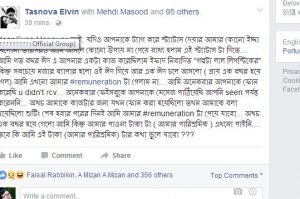 …ভাই, যদিও আপনাকে ট্যাগ করে স্ট্যাটাস দেয়ার আমার কোনো ইচ্ছা ছিল না, তারপরও আমি আসলে কোনো উপায় না পেয়ে বাধ্য হলাম এই স্ট্যাটাসটা দিতে। আমি গত বছর ঈদে আপনার একটা কাজ করেছিলাম ইফাদ নিবাদিত ‘গল্পটা লাল লিপস্টিক’–এর। কিন্তু ওই ঈদ গিয়ে আর এক ঈদ চলে এসেছে (প্রায় এক বছর হয়ে গেল), আমি এখনো আমার রেমুনারেশটা পেলাম না। আমি অনেকবার আপনাকে ফোন করেছি কিন্তু আপনি সাড়া দেননি। অনেকবার ফেসবুকে আপনাকে মেসেজ পাঠিয়েছি, আপনি দেখেননি। অথচ আমাকে কাজটার জন্য যখন ফোন করা হয়েছিল, তখন আমাকে বলা হয়েছিল, শুটিং শেষ হওয়ার পরের দিনই আমি আমার রেমুনারেশনটা পেয়ে যাব। অথচ এক বছর হয়ে গেল, আমি কিন্তু আমার আমার পারিশ্রমিক এখনো পাইনি।