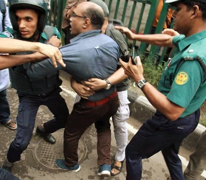 এ সময় বাধা দিলে সমাবেশকারীদের মধ্য থেকে বাকী বিল্লাহকে আটক করে প্রিজন ভ্যানে তোলে পুলিশ। তাকে ছাড়িয়ে নিতে প্রিজন ভ্যানে ওঠেন ঢাকা বিশ্ববিদ্যালয়ের গণযোগাযোগ ও সাংবাদিকতা বিভাগের অধ্যাপক ফাহমিদুল হক। তার সঙ্গেও পুলিশের বাকতিণ্ডা হয়।