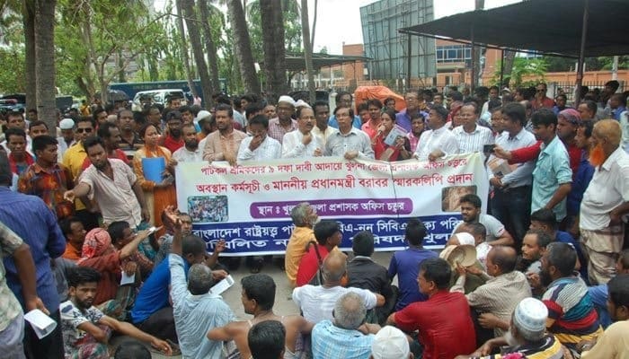 উল্লেখ্য, গত ৬ মে থেকে খুলনা যশোর অঞ্চলের নয়টি সরকারি পাটকলে শ্রমিকরা ১৩-১৪ সপ্তাহের বকেয়া মজুরি পরিশোধ ও মজুরি কমিশন বাস্তবায়নসহ ৯ দফা দাবিতে ১৫দিন যাবৎ ধর্মঘট ও সড়ক ও রেলপথ অবরোধের কর্মসূচি পালন করে আসছে।