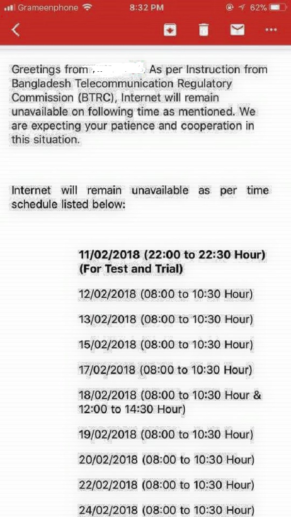 এর আগে রোববার রাত ১০টা থেকে সাড়ে ১০টা পর্যন্ত আধা ঘণ্টা পরীক্ষামূলকভাবে দেশের সব ইন্টারনেট প্রোভাইডারের ব্যান্ডউইথ প্রতি সেকেন্ড ২৫ কিলোবিটের মধ্যে সীমিত রাখতে বলা হয়েছে।