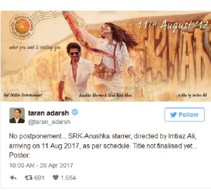 এ বিষয়ে ভারতীয় সিনেমার সমালোচক তরুন আদর্শ তার টুইটার জানিয়ে দিলেন: ১১ আগস্ট-ই শাহরুখ আনুশকা জুটির মুভিটি মুক্তি পাচ্ছে। এই তারিখ পাল্টানো হবে না।