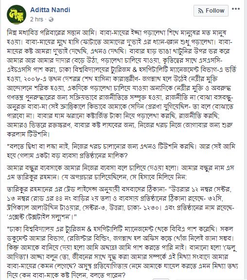 পোস্টের শুরুতে নিজের পড়াশুনা, পরিবারের অবস্থান এবং ছাত্র রাজনীতিতে আসার প্রেক্ষাপট ব্যাখ্যা করে আদিত্য লেখেন: “নিম্ন মধ্যবিত্ত পরিবারের সন্তান আমি। বাবা-মায়ের ইচ্ছা পড়ালেখা শিখে মানুষের মত মানুষ হওয়া। বাবা-মায়ের মুখে হাসি ফোটাতে আমাদের দু’ভাইয়ের ধ্যান-জ্ঞান শুধু পড়ালেখা। বাবা-মায়ের কষ্ট আমরা দু’ভাই দেখেছি, এখনও দেখছি।