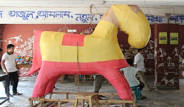 বিশ্ববিদ্যালয়ের চারুকলা বিভাগে গিয়ে দেখা যায় শিক্ষার্থীদের দারুণ ব্যস্ততা। নানারকম ছবি আঁকছেন তারা, কেউবা ডামি তৈরিতে ব্যস্ত। এবারের মঙ্গল শোভাযাত্রায় লোকজ সংস্কৃতিকে প্রাধান্য দিয়েই কাজ করছে চারুকলা বিভাগ।