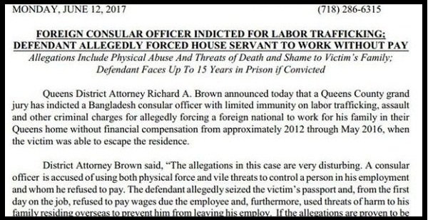 বাংলাদেশী দূতাবাস কর্মকর্তা আনুমানিক ২০১২ সাল থেকে ২০১৬ সালের মে মাস পর্যন্ত কোনও ধরনের অর্থ ছাড়াই একজন ব্যক্তিকে তার বাড়িতে কাজ বাধ্য করেন। এরপর মোহাম্মদ আমিন নামে ওই গৃহকর্মী গত বছরের মে মাসে পালিয়ে গিয়ে পুলিশের কাছে অভিযোগ জানায়।