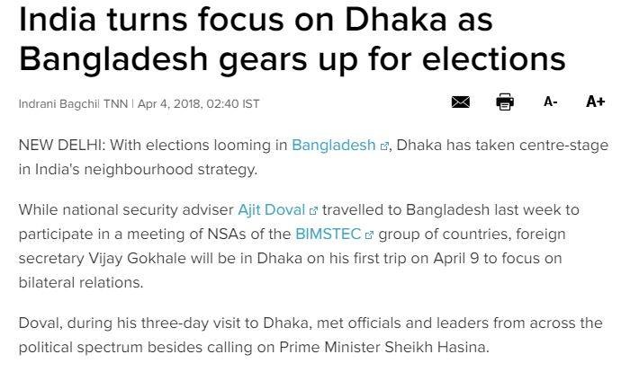 টাইমস অফ ইন্ডিয়ার এক প্রতিবেদনে বলা হয়েছে, বাংলাদেশ তার জাতীয় নির্বাচনের দিকে এগিয়ে যাওয়ায় প্রতিবেশীর জন্য নিজেদের কৌশল ঠিক করতে ভারতের চিন্তার কেন্দ্রে এখন ঢাকা।
