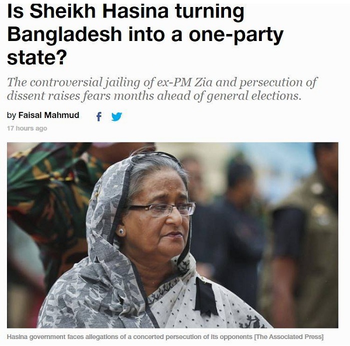 তবে, ডিসেম্বরে অনুষ্ঠিতব্য নির্বাচনকে সামনে রেখে আল জাজিরা অনলাইন প্রশ্নসূচক শিরোনাম করেছে: শেখ হাসিনা কি বাংলাদেশকে একটি একদলীয় শাসনের দেশে পরিণত করছেন?